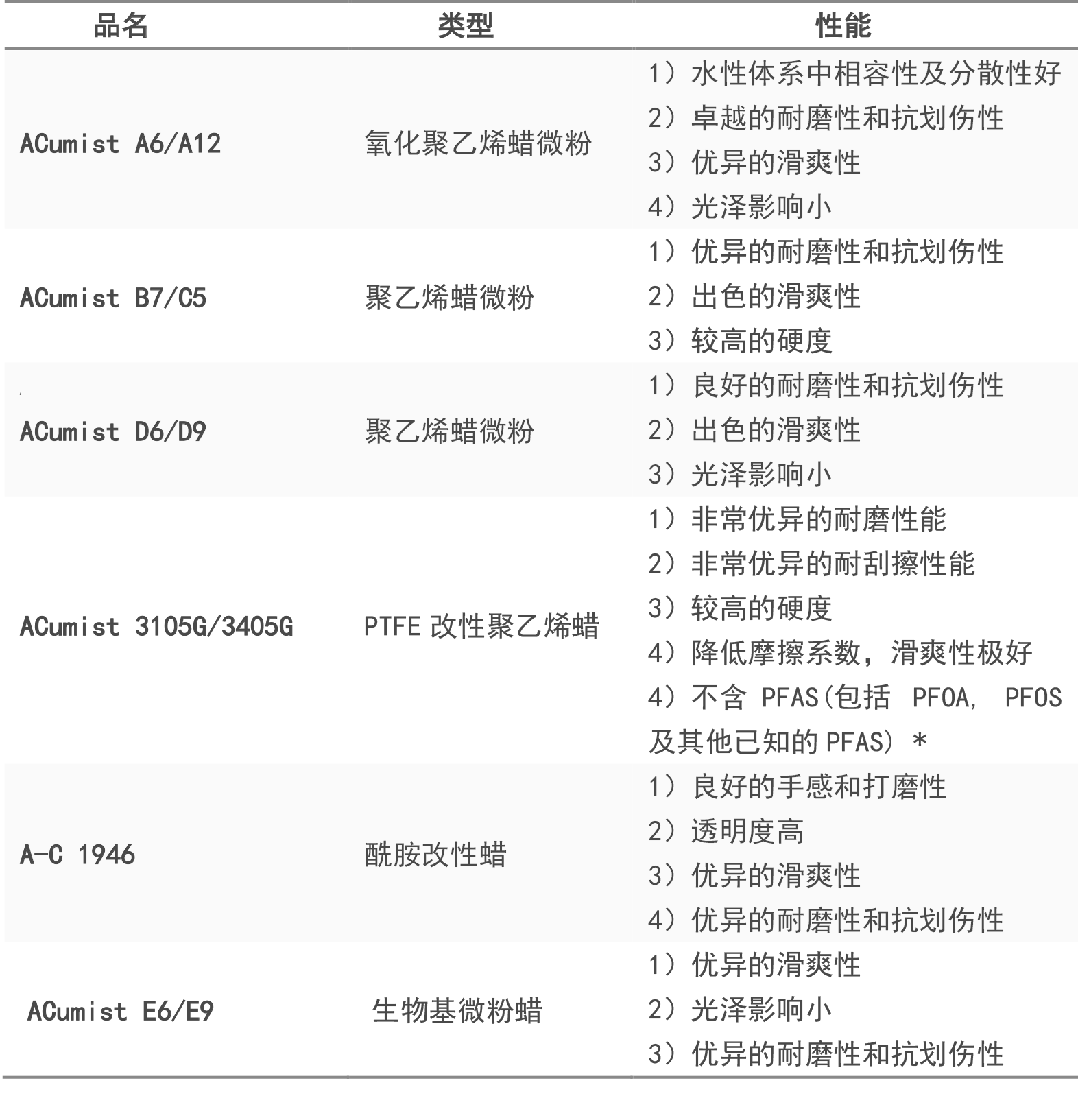 ACumist 系列微粉化产品在木器漆以及塑胶漆对于外观要求高,同时需要兼具耐磨抗刮手感等性能, 微粉蜡是一个非常好的选择。