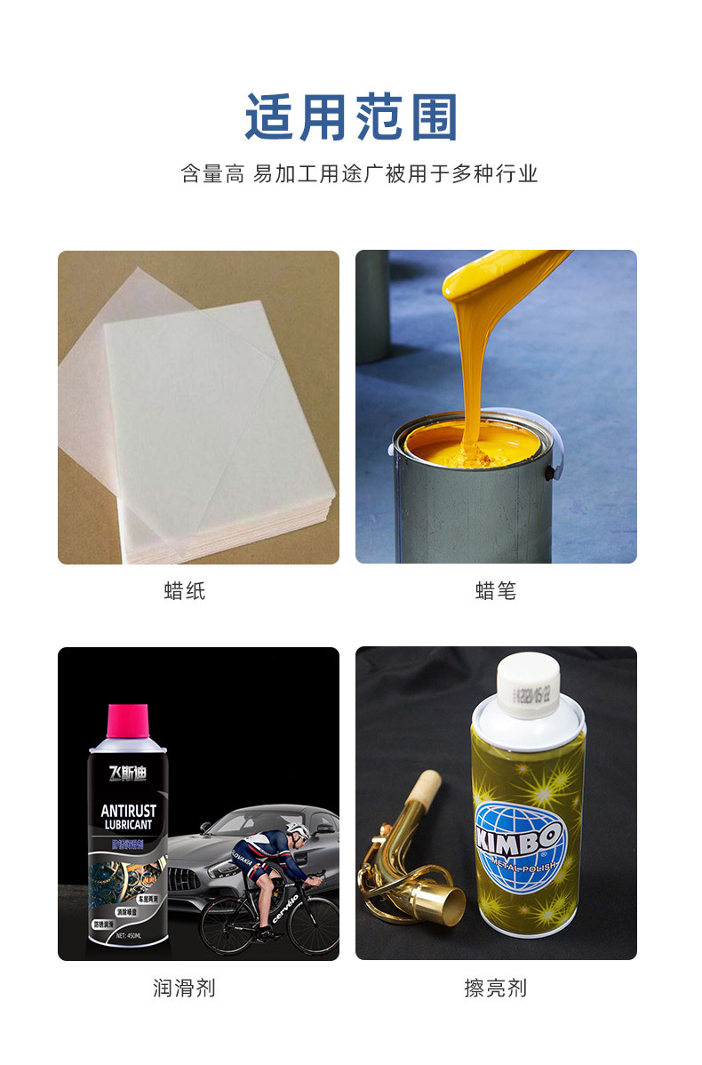 1.适用于长时间燃烧的、良好的不透明性、硬度要求高的蜡烛。