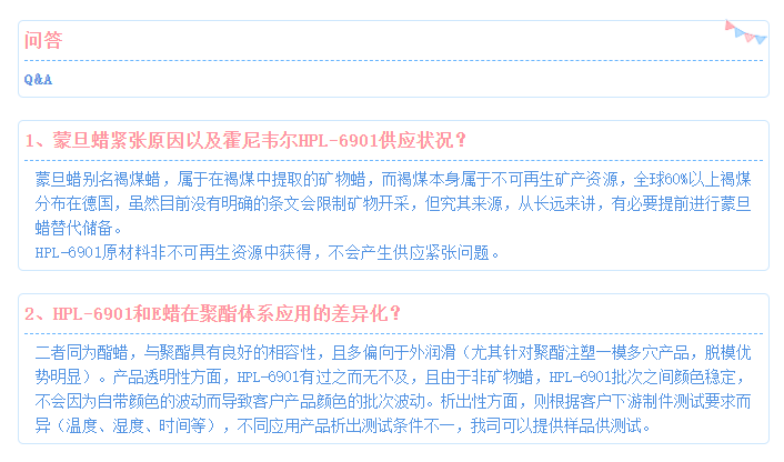 蒙旦蜡由于具备有出色的耐温性,能够匹配聚酯加工温度而不失效/析出,同时存在的极性链段和非极性链段能够兼具内外润滑以及相容性,因此通常作为连续脱模的解决方案,然而由于蒙旦蜡属于矿物类不可再生资源(来源于褐煤),因此而产生的供应问题使得客户不得不寻求新的替代方案。